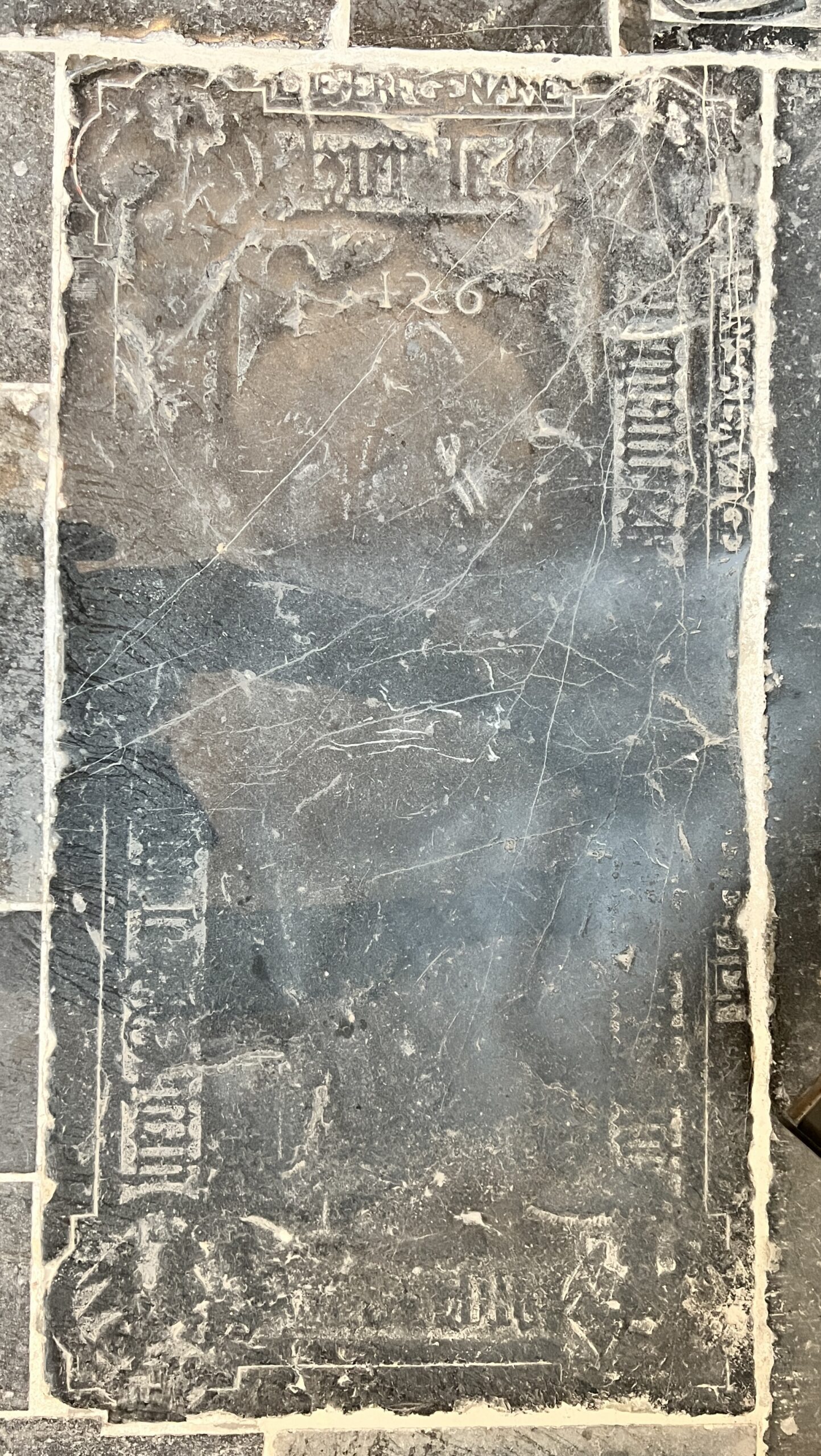 Deze zerk is binnen het randschrift genummerd '126' en heeft een formaat van 98 x 184 cm. De zerk heeft een brede rand met daarop een randschrift in gotische letters. In de hoeken bevinden zich gotische vierpassen met daarbinnen de symbolen van de vier evangelisten. Van het randschrift zijn slechts enkele woorden te lezen: