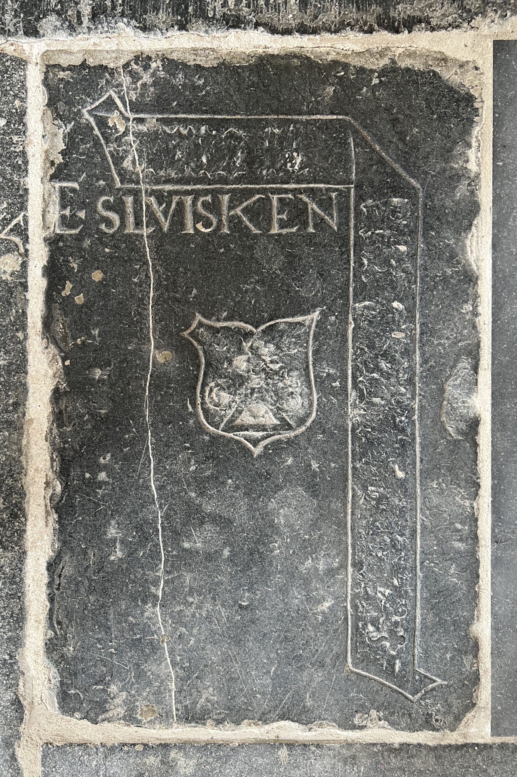 Rechts onder het opschrift bevindt zich een klein wapenschild, met een afwijkende vorm in de linker bovenhoek. Op het wapenschild zijn nog resten van een familiewapen te zien en twee letters. Muschart maakte in 1939 een tekening van dit familiewapen (zie afbeeldingen).