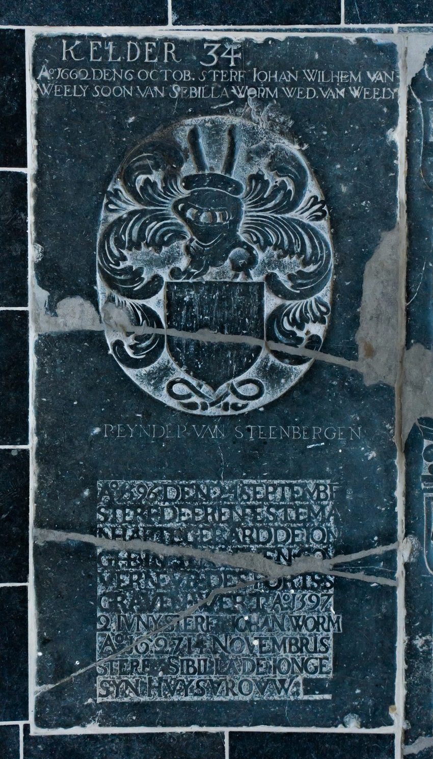 In de kerkboeken staat grafzerk met nummer 34 geregistreerd op naam van 'Captain de Jongh'. Ook staat er een vermelding van de dochter van de kapitein op 16 september 1645 en een tekst (1663) over hopman Herman Worm [...] nicht Sibilla Worms, weduwe van Jan van Wely. In latere kerkboeken staat bij grafzerk met nummer 34 genoteerd 'is de kelder van Reijnder van Steenbergen'.