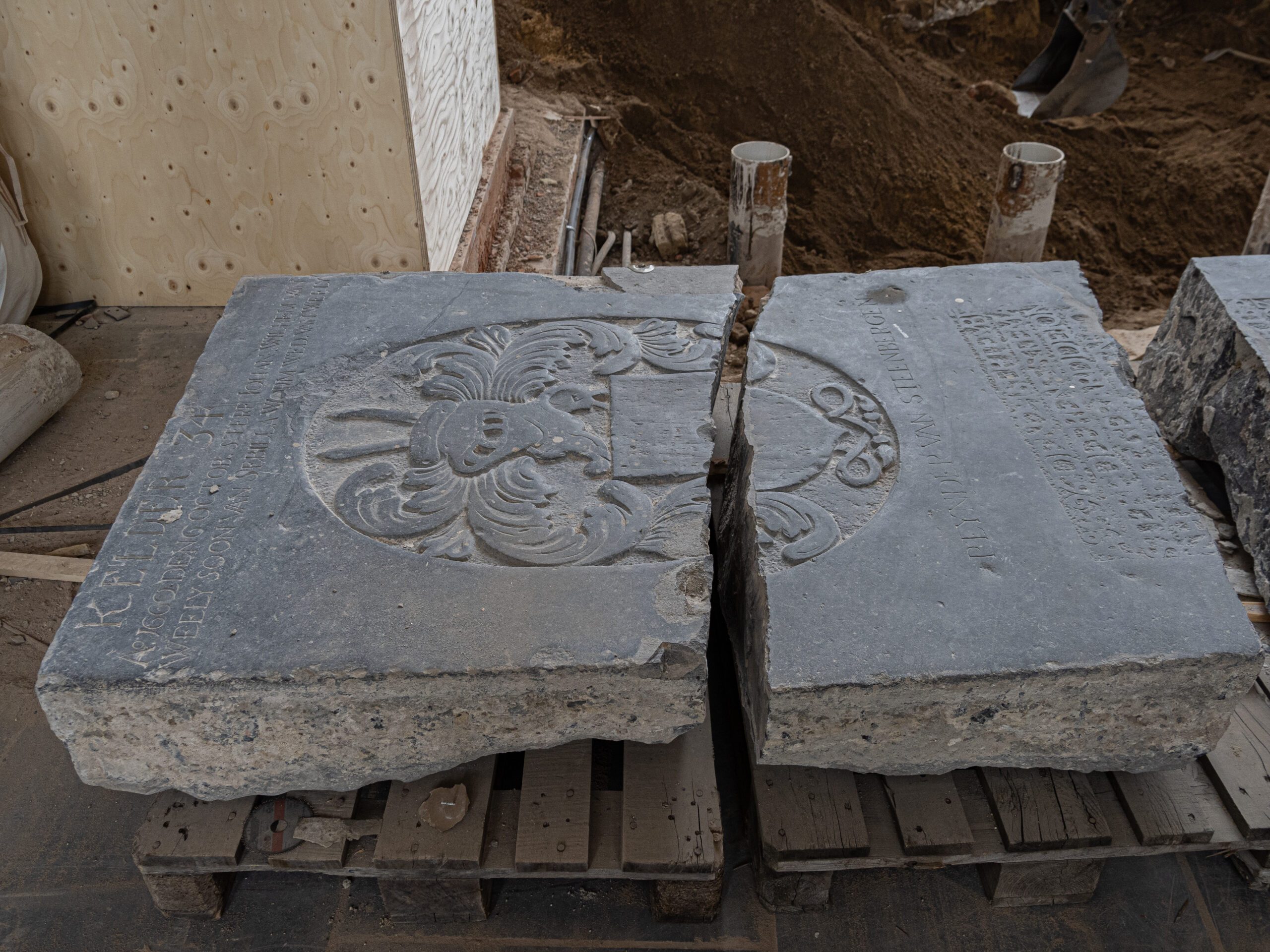 Vlak onder de inzinking bevindt zich de naam “REYNDER . VAN . STEENBERGEN”, in Latijnse letters ingehakt in de steen.