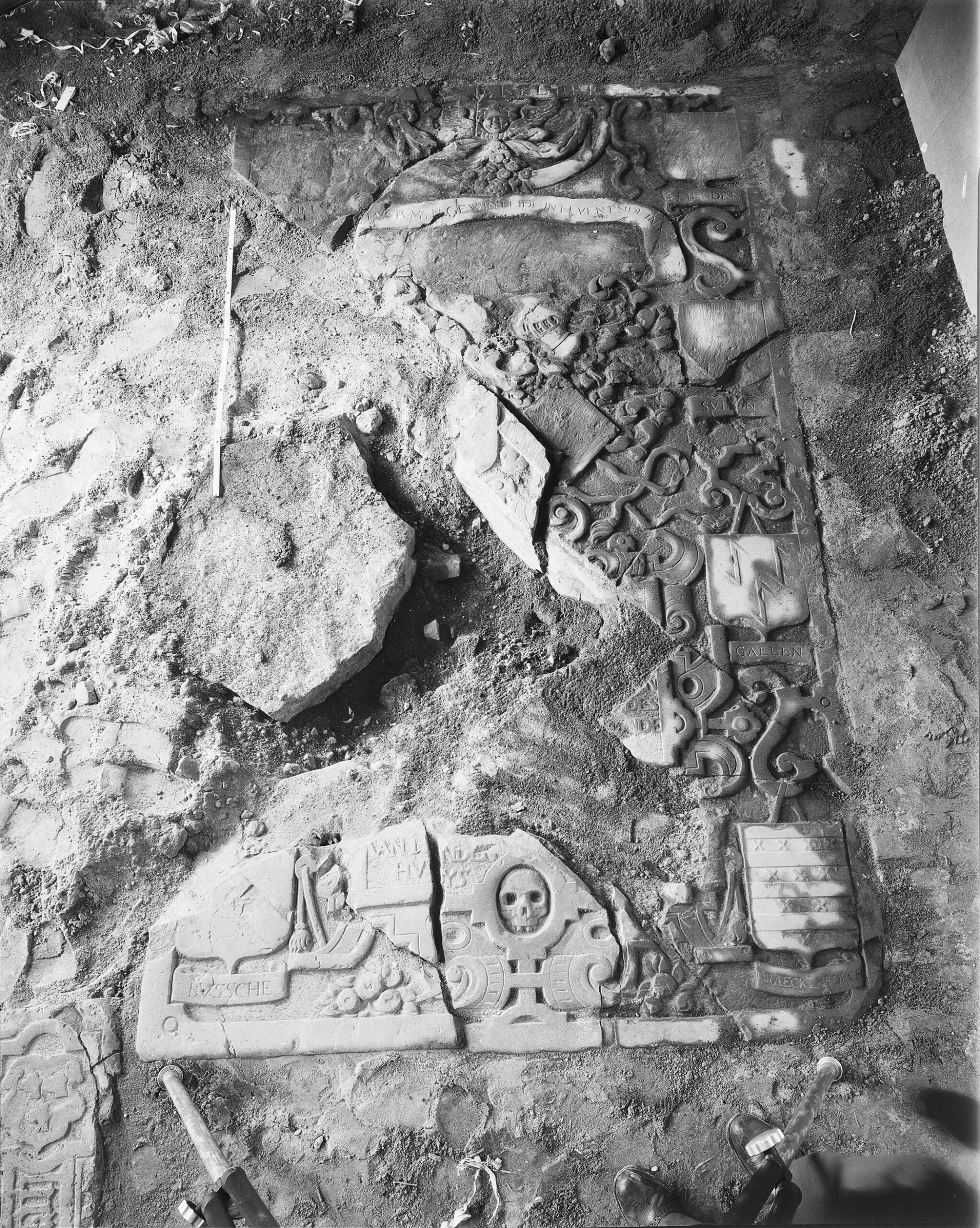 De grafzerk raakte in WOII zwaar beschadigd. Naar aanleiding van de foto uit 1956 van G.Th. Delemarre kunnen we een beschrijving van de grafzerk geven.