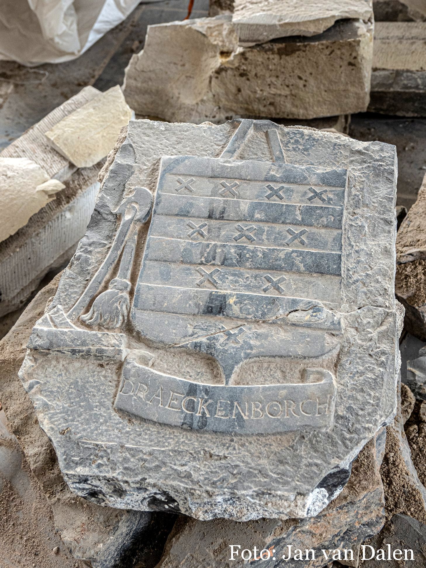 Aan beide zijden van de grafzerk bevinden zich langs de rand vier wapenschildjes met daaronder een lint met de familienaam. Aan de linkerkant is boven de familienamen "--NEN" te lezen en linksonder "BVSSCHE". Aan de rechterkant zijn, van onder naar boven de volgende familienamen te lezen: "LIENDEN", "SUILEN", "GAELEN" EN "DRAECKENBORCH". Alle familiewapens zijn afgehakt, behalve van Gaelen en Draeckenborch (Van Bossche is ook nog een restant wapen te zien). Bijzonder is dat het laatste wapen van Draeckenborch met bijbehorende naam nog tot 2019 in de Eusebiuskerk te zien is geweest (zie afbeelding). Na de renovatiewerkzaamheden is het helaas verdwenen.