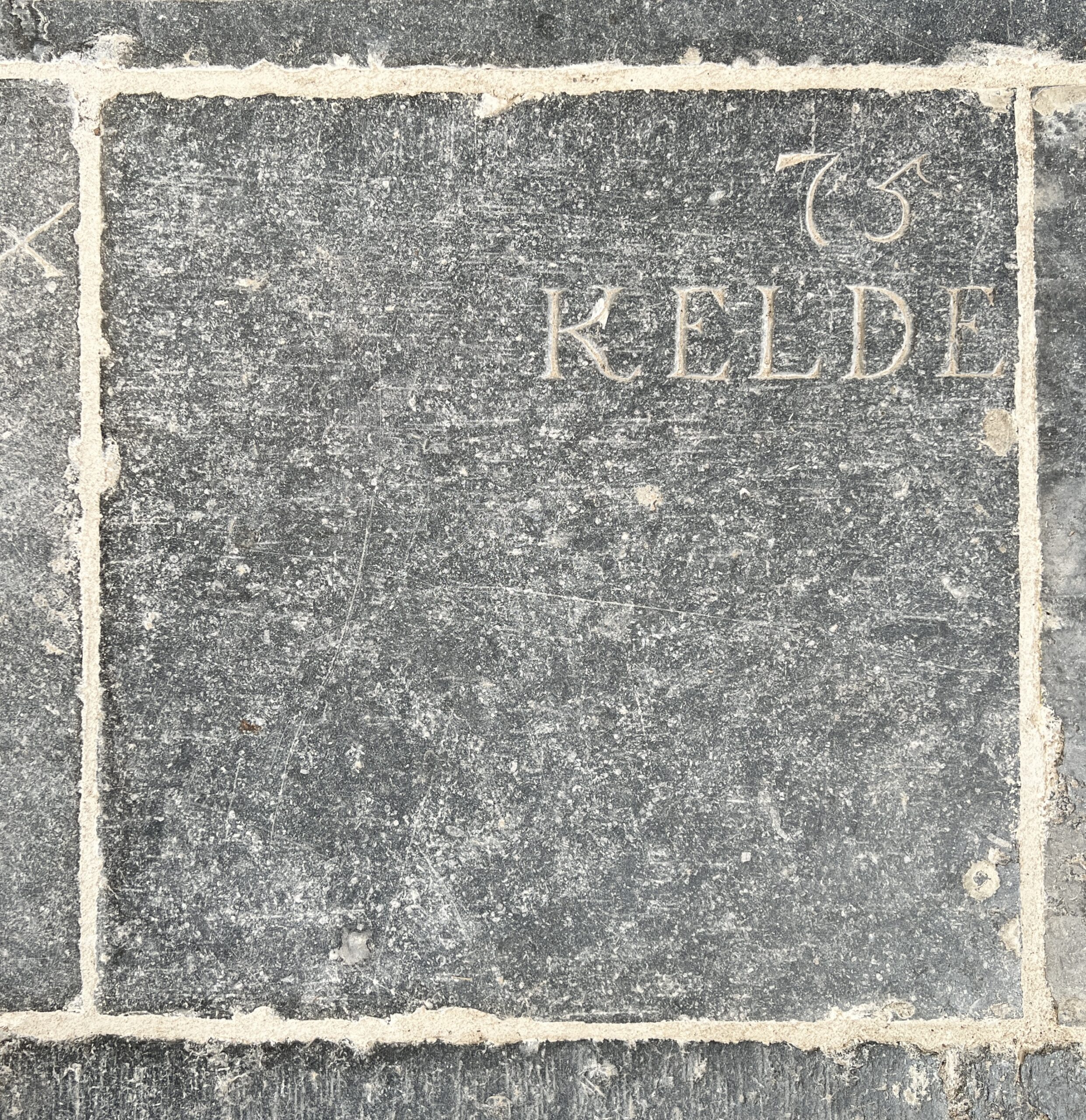 Ongetwijfeld heeft hier ' KELDER ' gestaan. Normaal gesproken zou het nummer 75 in het midden van de zerk uitgehakt zijn. We kunnen aannemen dat deze zerk groter is geweest.