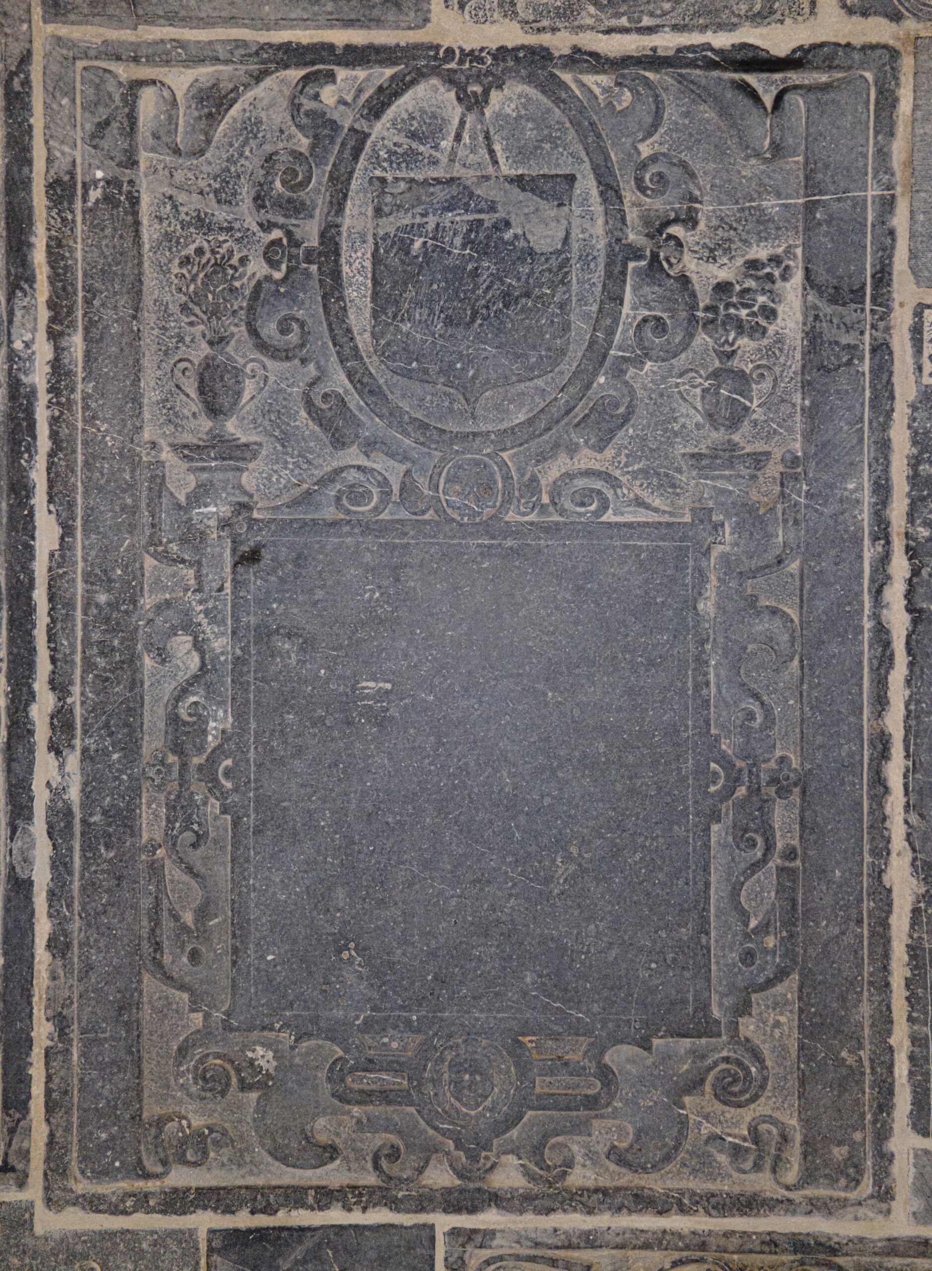 Vlak daaronder bevindt zich een langwerpige, staande rechthoek, met smalle rand. De tekst is volledig afgesleten. De rand is versierd, met links en rechts boven twee vazen, met oren. In de linker vaas een vos bloemen en in de rechter vaas een rookkolom. Dit betreft Vanitas symboliek, die verwijst naar de vergankelijkheid van het leven.