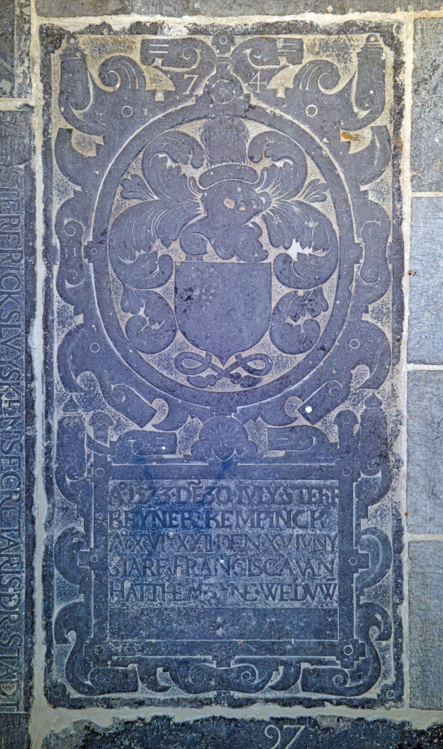 Ene Reyner Kempinck staat met zijn familiewapen, Anno 1657, opgetekend in het wapenboek van de St. Joosten Schutterij (zie afbeelding). Dit moet een nazaat zijn van de Reyner die hier begraven ligt.